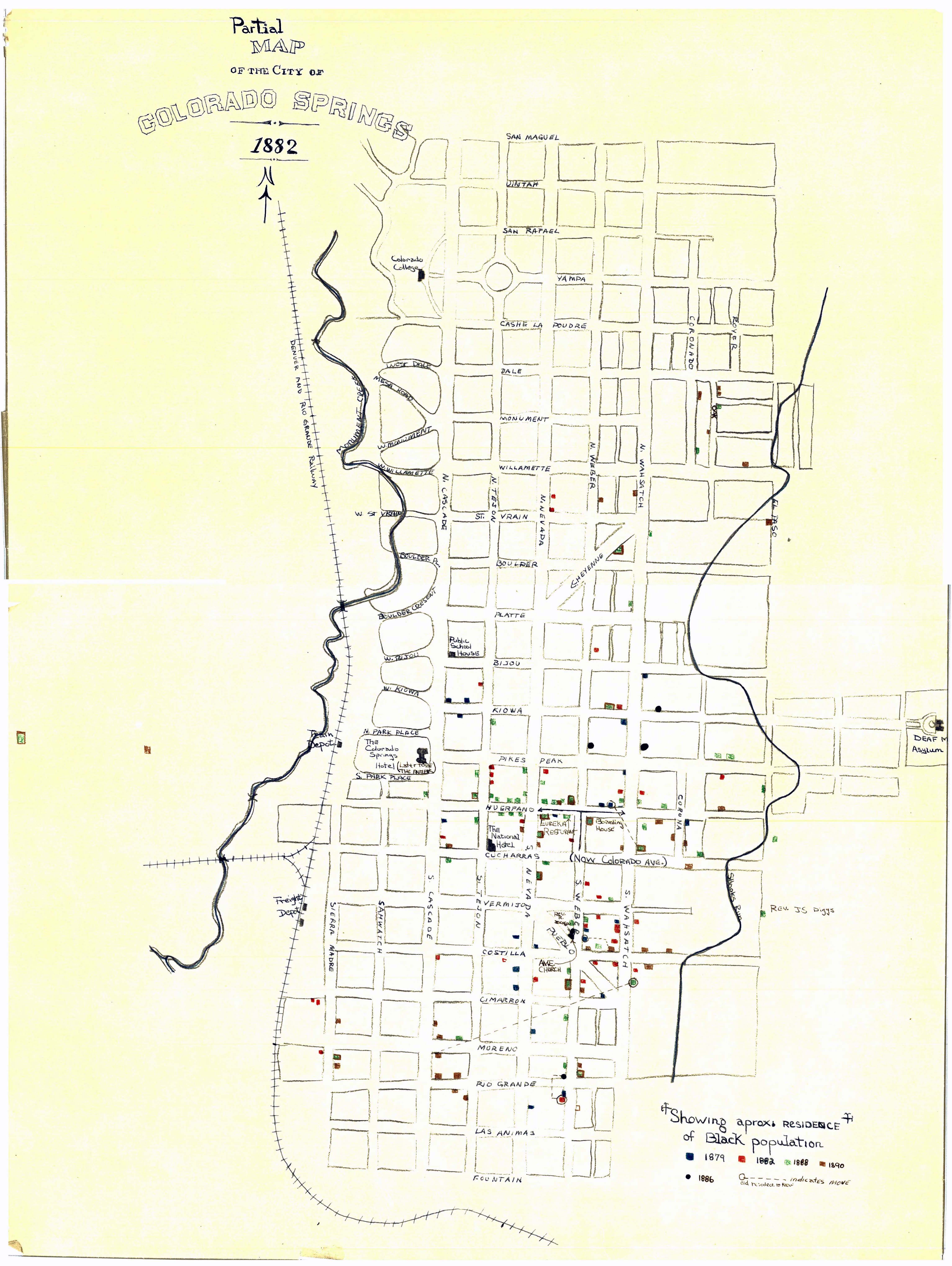 Hand drawn 1882 map of Colorado Springs showing "residence of Black population 1879, 1882, 1886, 1888, 1890." Original: Van Diest Papers, Ms 0233, Special Collections Map Case Drawer 16. Probably made using early CS directories, which designated Black residents. Digitized July 2020.