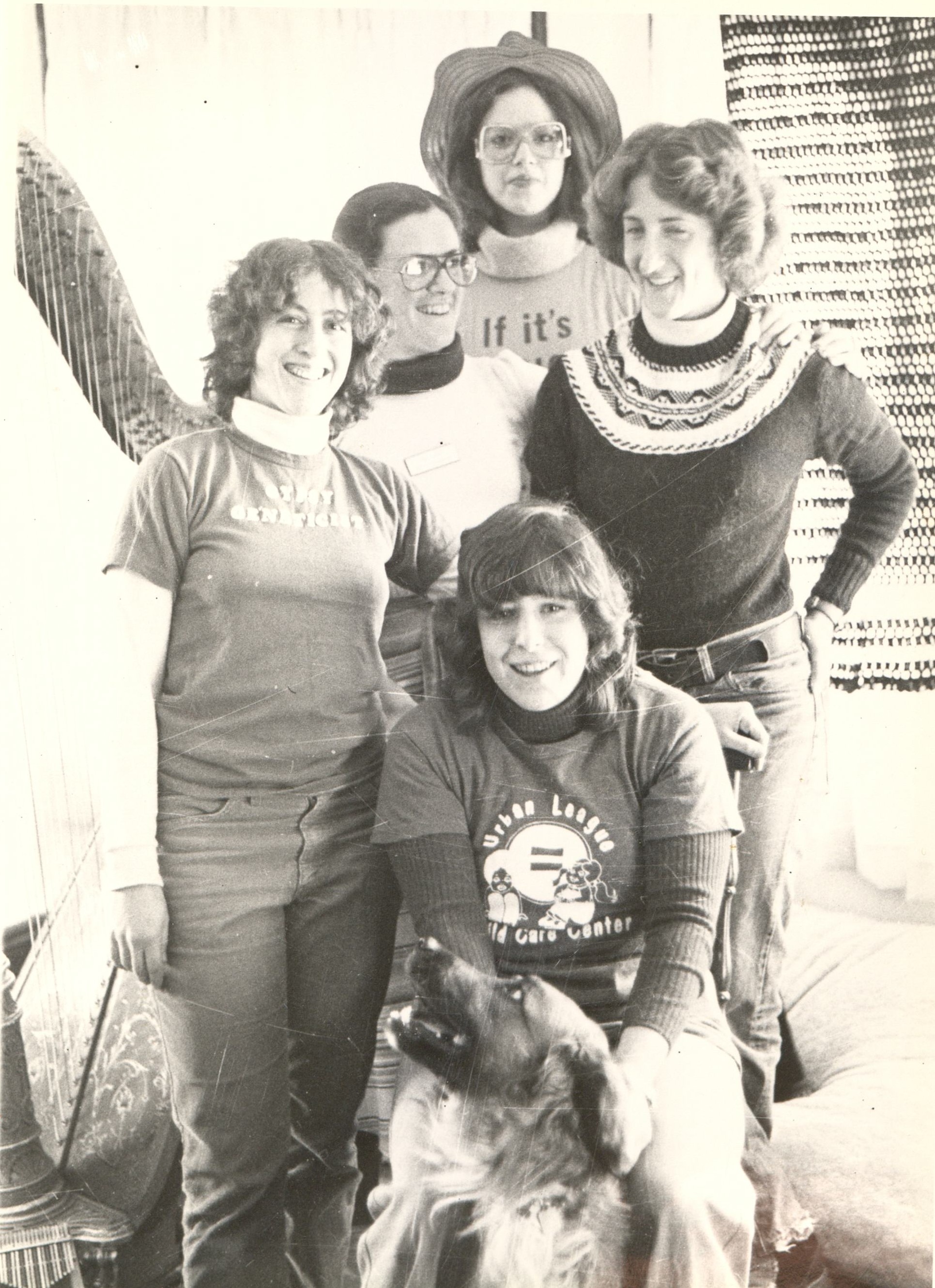 Five students posing with a dog in front of a large harp.